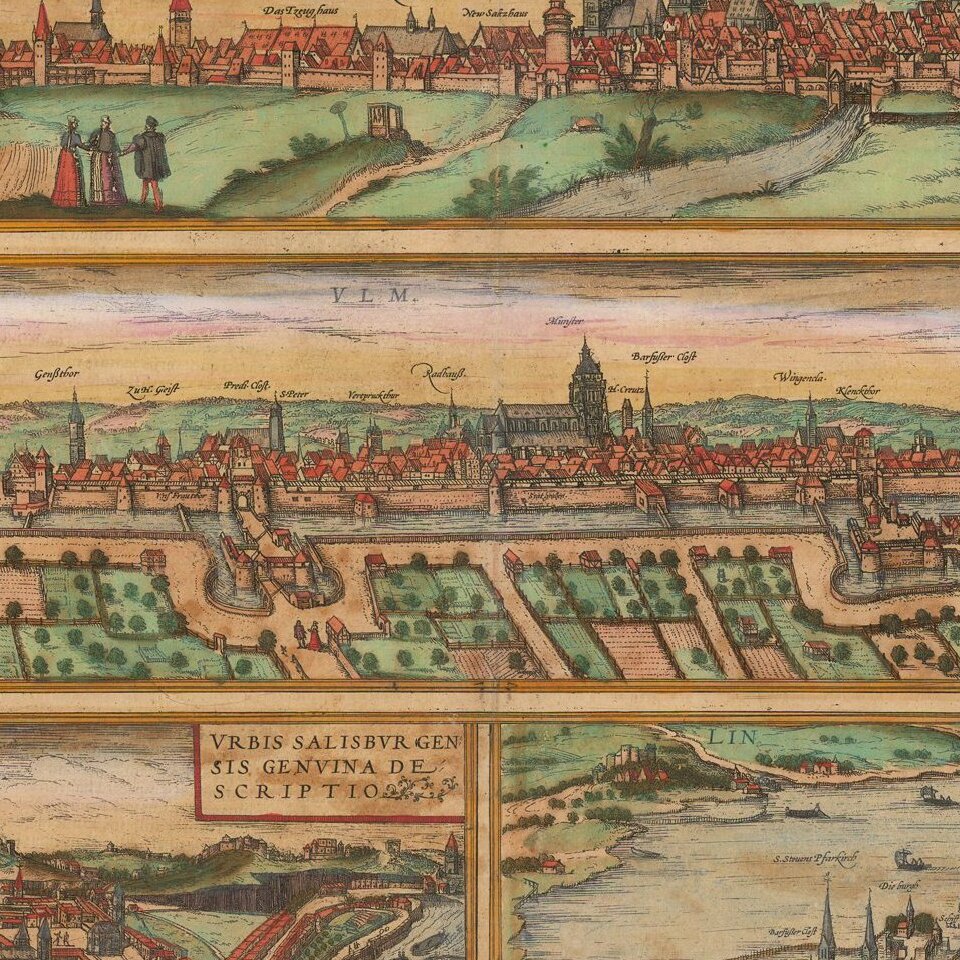Georg Braun (1541-1622) was born and died in Cologne. His primary vocation was as Catholic cleric; he spent thirty-seven years as canon and dean at the church St. Maria ad Gradus, in Cologne. Braun was the chief editor of the Civitates orbis terrarum, the greatest book of town views ever published. His job entailed hiring artists, acquiring source material for the maps and views, and writing the text. In this role, he was assisted by Abraham Ortelius. Braun lived into his 80s, and he was the only member of the original team to witness the publication of the sixth volume in 1617.