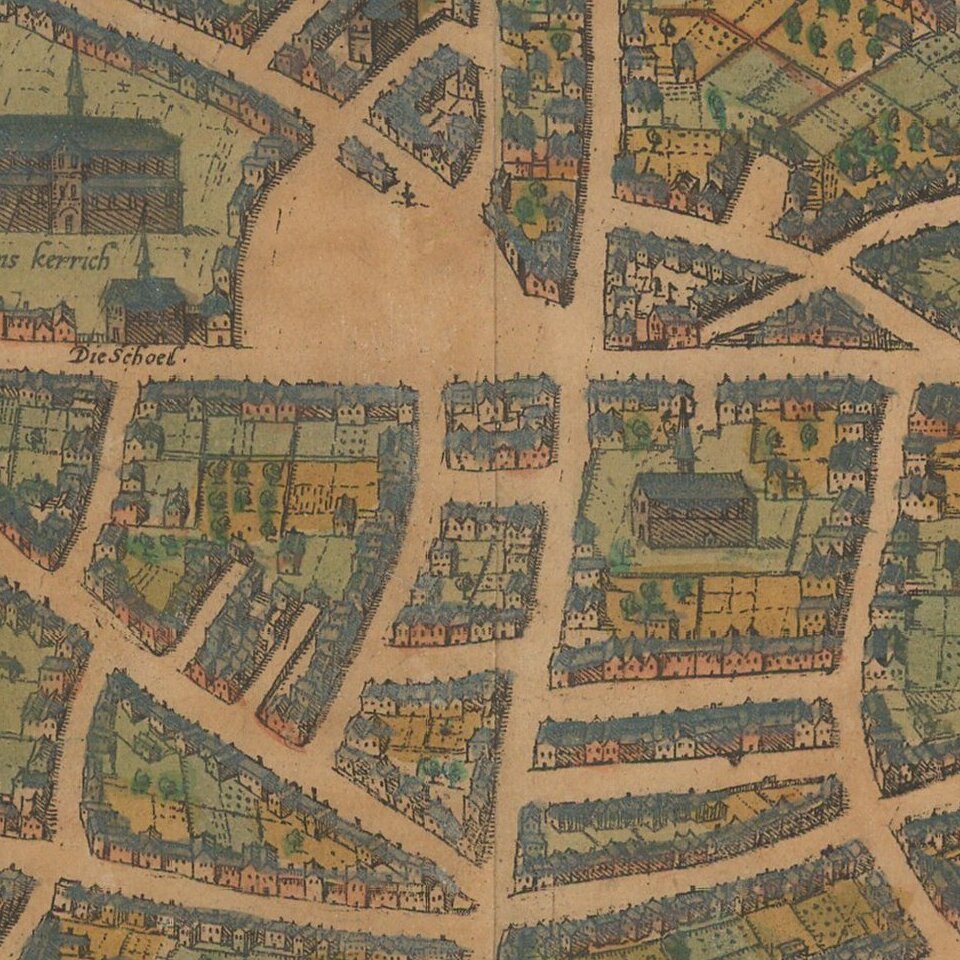 A bird's-eye view of the city, where the royal castle of Valkhof can be seen on the right within the city walls. In the city center is the tall Gothic Sint-Stevenskerk. This imperial and Hanseatic city was going through a troubled phase in Braun and Hogenberg's time. In 1543 Nijmegen, together with Guelders, became Spanish as a result of the Treaty of Venlo. In 1579 the city joined the United Provinces and was besieged and captured in 1585 by the Spanish in the course of the Dutch Revolt. The Orange party did not suceed in recapturing Nijmegen until 1591.