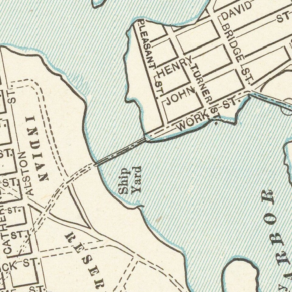 The map is centered on Victoria harbor, with a large Indian Reserve on the waterfront. The line of the E & N Railroad extends westward from downtown and a large park in the southern part of the map.