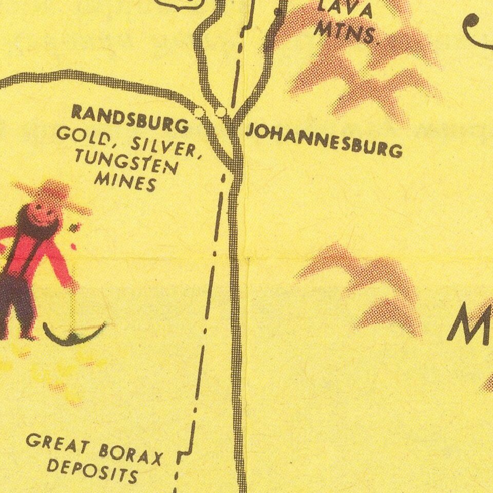 The map combines pictorial vignettes with a tourist road map of the region, with text describing tourist opportunities in each of Southern California's counties.
