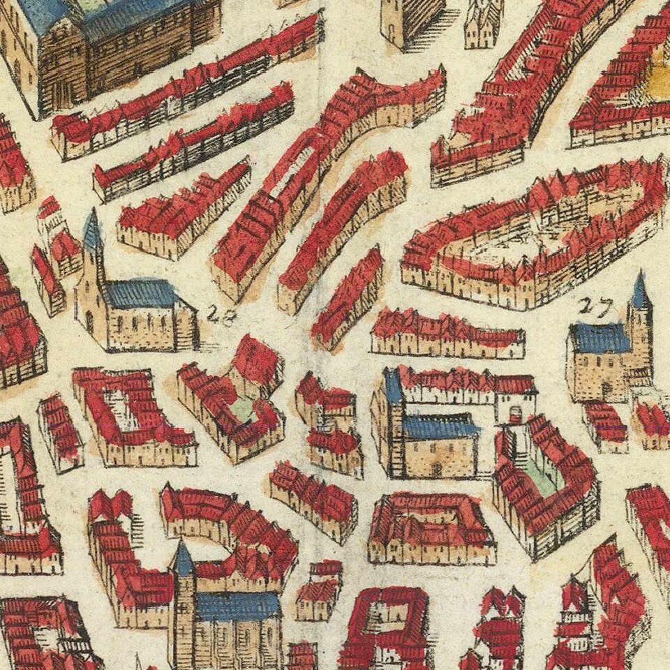 Mathaus Merian (1593-1650) was the father of engraver Matthäus the Younger, and of the painter, engraver, and naturalist Maria Sibylla Merian. He was born in Basel, Switzerland and trained in engraving in Zurich. After a time in Nancy, Paris and Strasbourg, he settled in Frankfurt. While there, he worked for Johann Theodor de Bry, the publisher and son of the travel writer. In 1617, he married Maria Magdalena de Bry, Johann Theodor’s daughter. In 1623, Merian took over the de Bry publishing house upon the death of his father-in-law. Merian’s best known works are detailed town views which, due to their accuracy and artistry, form a valuable record of European urban life in the first half of the sixteenth century