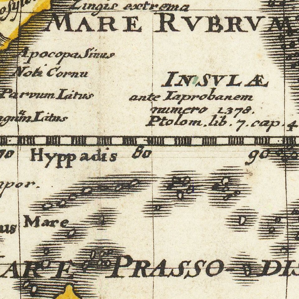 The many place names given are of additional interest. Sri Lanka is named "Taprobana" in the Ptolemaic tradition. Southern Africa is labeled as a "Terra Beteribus Incognita," or mature unknown land. Near Beijing lies a "Sera Metropolis," possibly referring to the city. Ptolomy is referred to often in the map, with specific chapters cited to defend cartographic choices. The map is ostensibly a map of the Old World as it was known to ancient geographers; Weigel has preserved his modern geography but overlaid it with toponyms from ancient sources.
