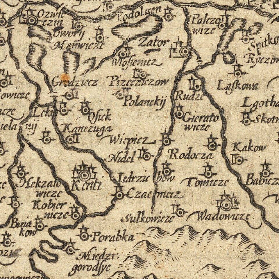 The towns of Zatoriensis [Zator] and Oswieczimesis [Oswiecim] give their name to the title of this map, while other prominent cities of the region can be located, including present-day Bielsko-Biala and Skoczow. The Duchy of Oswiecim dates back to the fragmentation of Poland in the 14th century, and it was split into several smaller duchies, including the Duchy of Zator in 1445. The Duchies would be rejoined with Poland shortly after, and these lands would remain Polish until the First Partition in 1772.