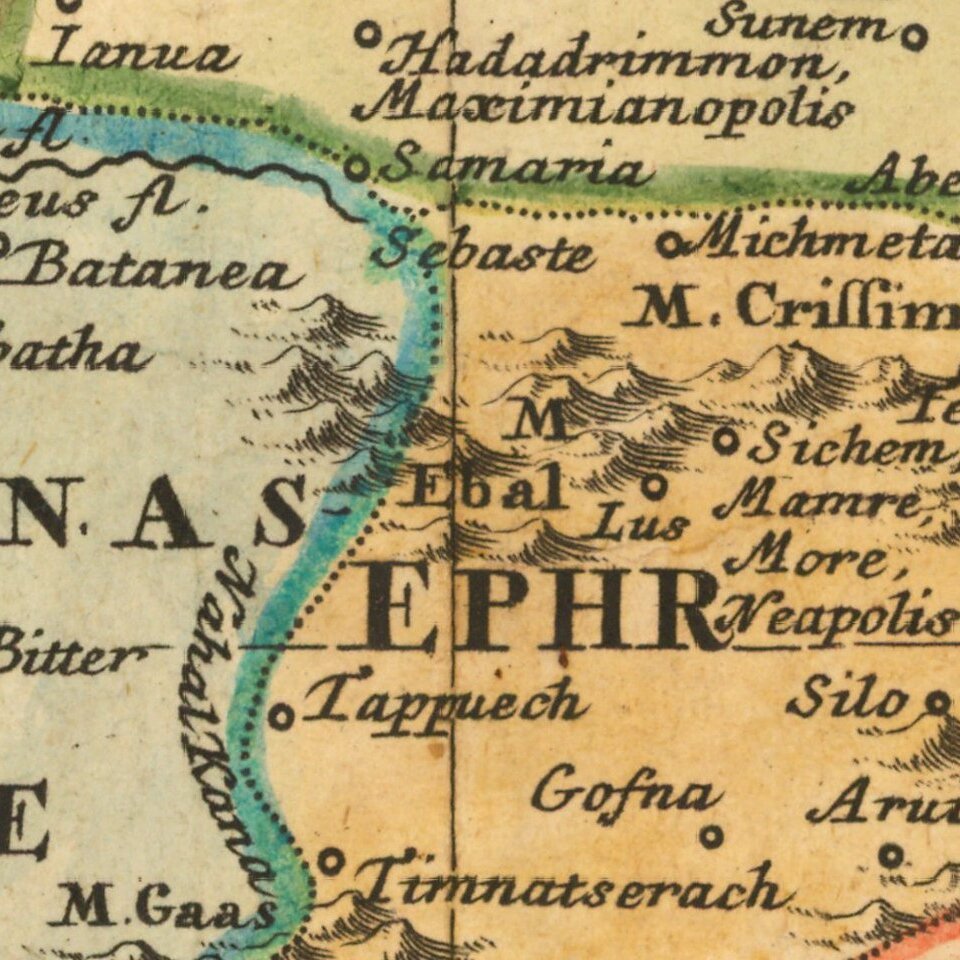 Detailed map of the Holy Land, colored according to the lands of the 12 tribes, with two large cartouches.