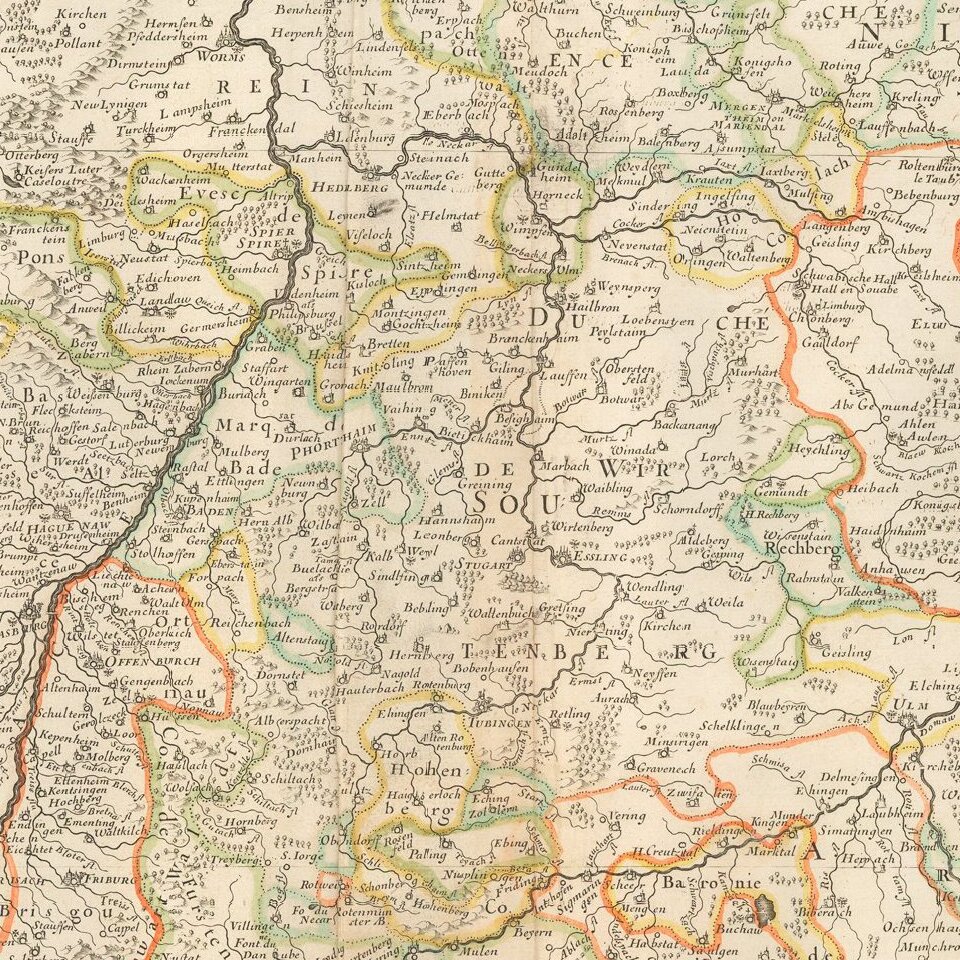 Nice old hand-color example of Sanson's 1641 double-page engraved map of the Rhineland and Alsace.