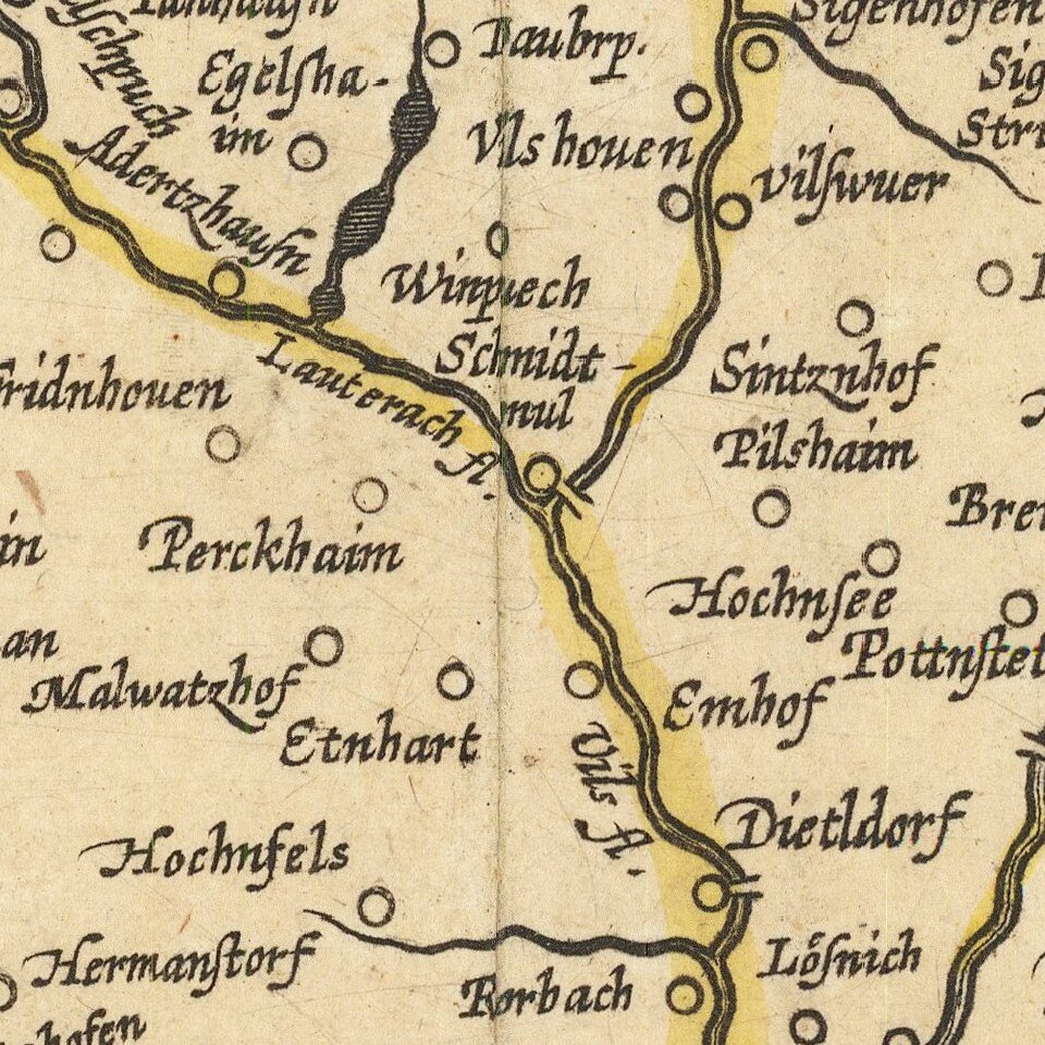 Decorative regional map of the Palatinate of Germany, from the Danube and north, including Nuremberg.
