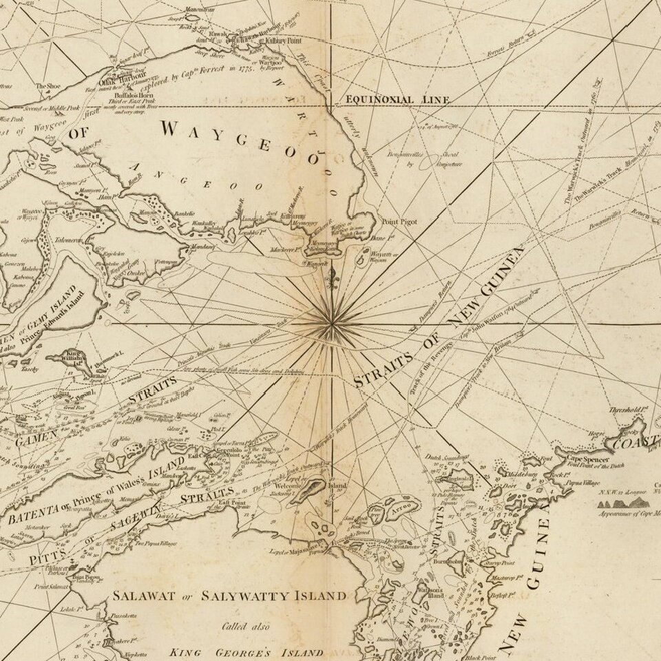This region was of great importance to the East India Company and the important spice trade. The chart was designed for use by ships trading in the East Indies. The routes of many explorers are identified, including Dampier, Forrest, Bougainville, Walton, Hogan, and the ships Warwick and Cornwallis.