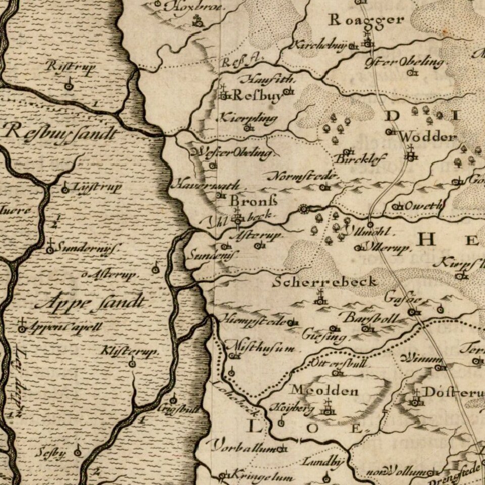 Detailed map of western Denmark, extending from Fano Island in the north, to Sylt Island in the south, showing what was then the western part of the Prefecture of Haderslev.