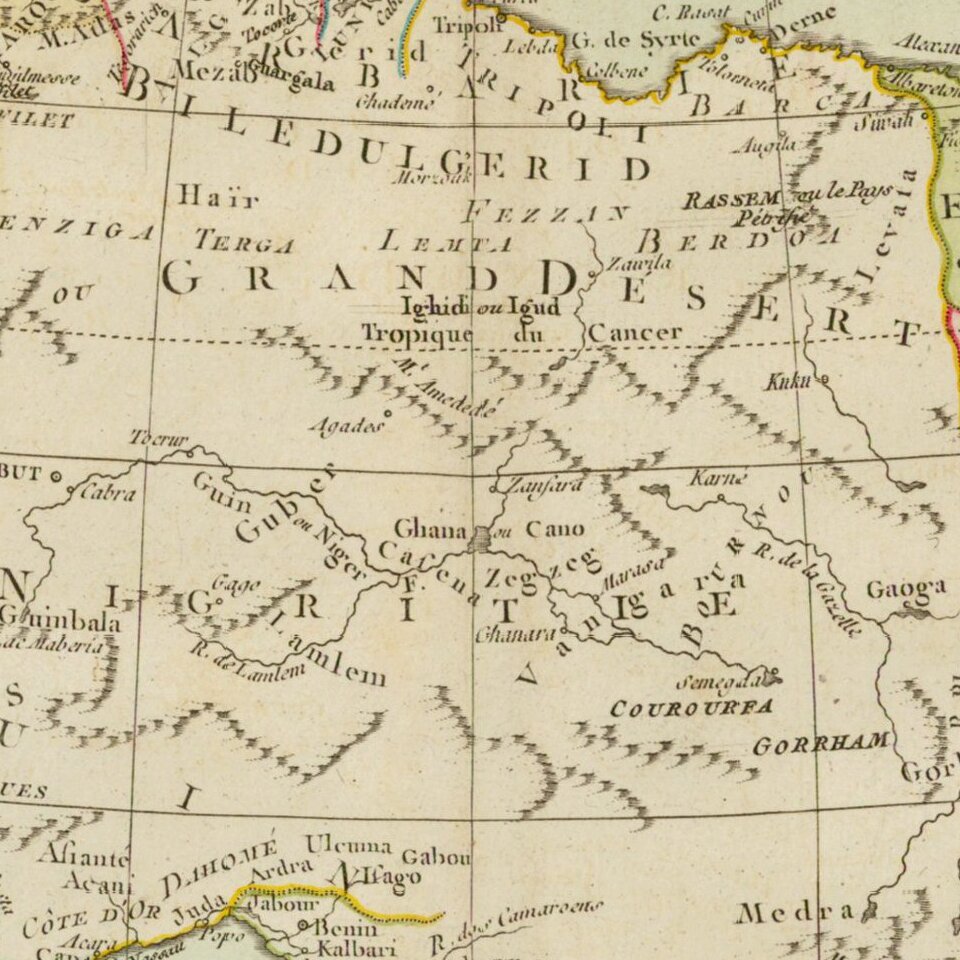 Louis Brion de la Tour (ca. 1743-1803) was a French geographer and demographer. Little is known about Louis’ early life, but some glimpses of his professional life survive. He did achieve the title of Ingénieur Géographe du Roi. Much of his work was done in partnership with Louis Charles Desnos, who was bookseller and geographical engineer for globes to the Danish Crown. He worked on the Indicateur fidèle ou guide des voyageurs, qui enseigne toutes les routes royales between 1762 and 1785. During his career he also worked on several atlases. By 1795, he had gained a pension from the National Assembly. Perhaps this pension was granted in part because his son, also Louis Brion de la Tour (1763-1823), was an engraver who made Revolutionary prints, as well as maps.