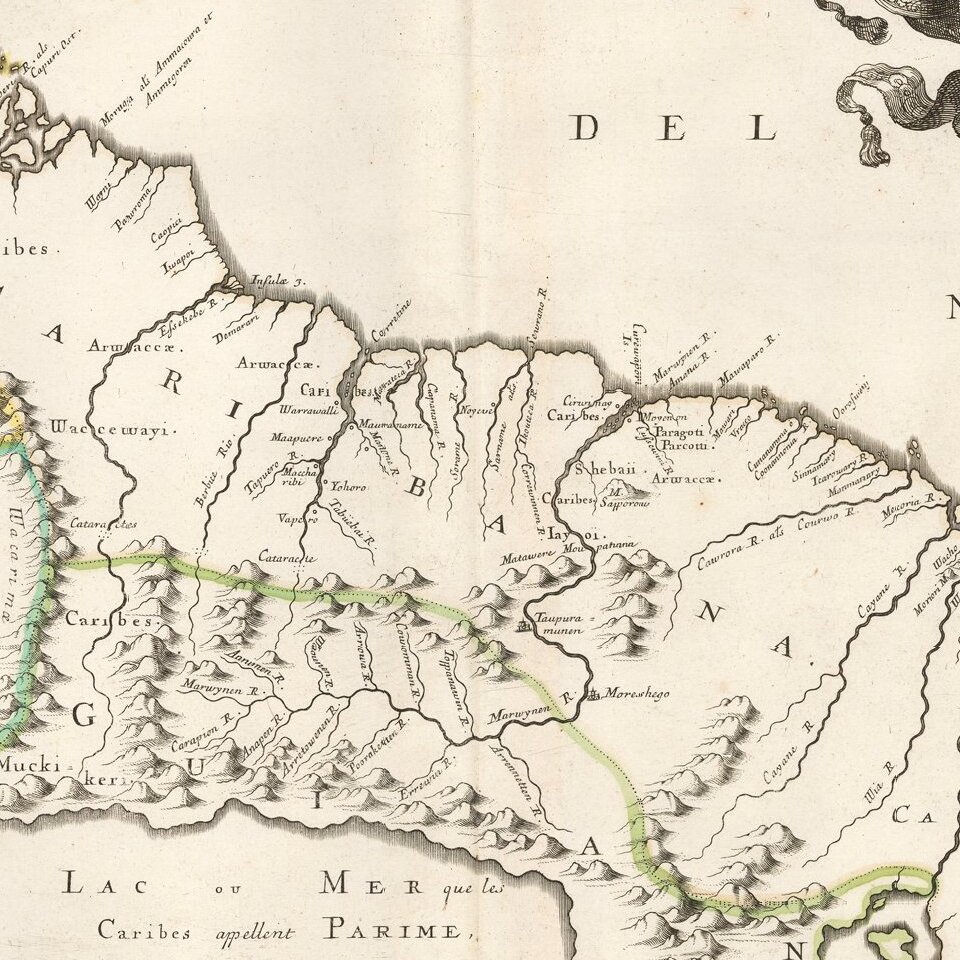 Terrific early regional map of the Northeastern part of South America, extending from Trinidad and Margarita Islands in the north to the mouth of the Amazon and Lac Caribes or Parime.
