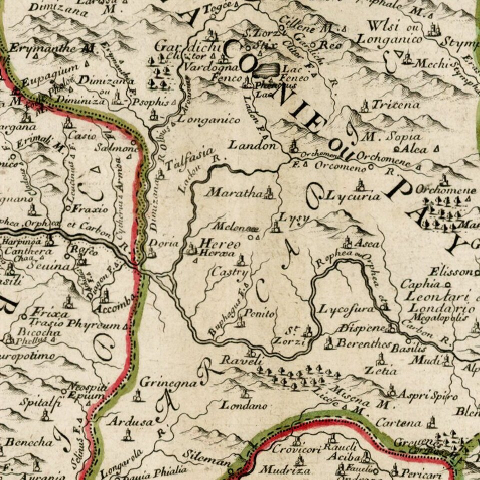 Highly detailed map, which includes 12 inset plans of fortified towns and harbors for places within the bounds of the map. The dedication note that the map was prepared from Intelligence gathered from the Venetians and Ottoman Turks, with the plans of each of the forts bearing a date between 1685 and 1687. Zacharachis notes that most editions of the map have the dates in the lower right corner changed in manuscript. We were unable to find any examples of the map appearing at auction or in dealer catalogues in the past 30 years, but we do note the copy in the Catalogue of Maps, Prints & Engravings ... Presented by HIs Majesty King George the Fourth To The British Musuem (Vol. II; p 58).