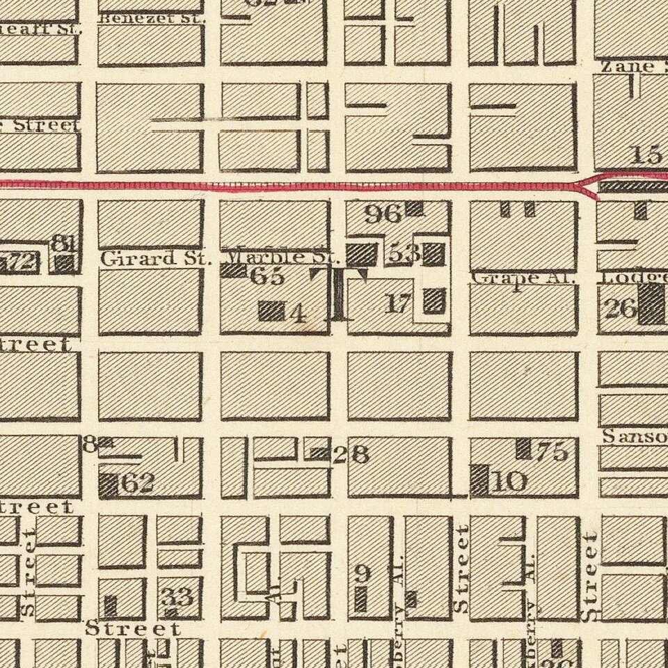 While proposed city planning stretches off of this map, development barely reaches the Schuylkill River, as indicated by the shaded city blocks. Some small perturbations exist to the street grid, the most noticeable of which is Francis Ville, a pre-existing small village that became engulfed by Philadelphia shortly after the map was made.