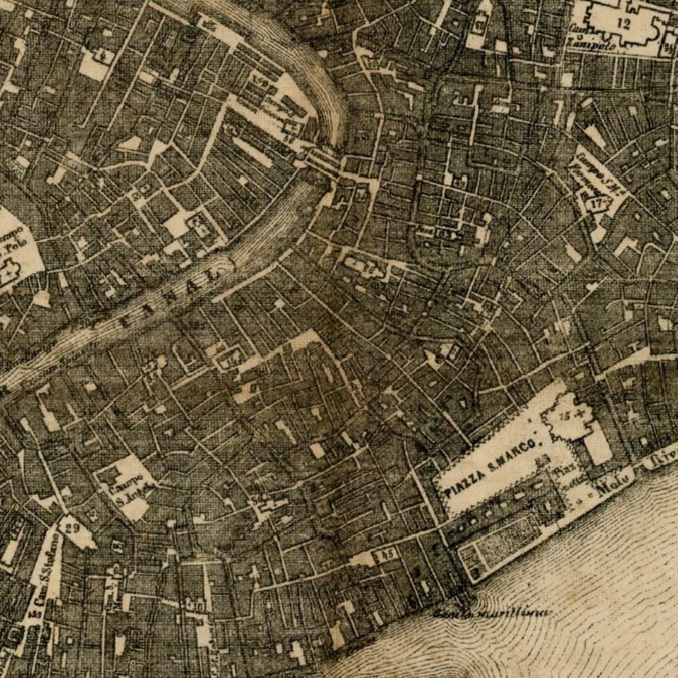 Decorative map of Venice, printed on linen by Willem Seiffert.
