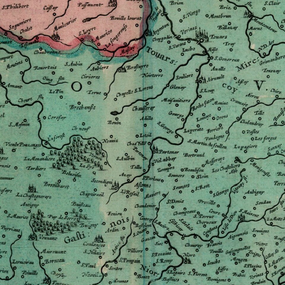Decorative early map of the Poictou region, including Isle d'Re and Isle d'Oleron.