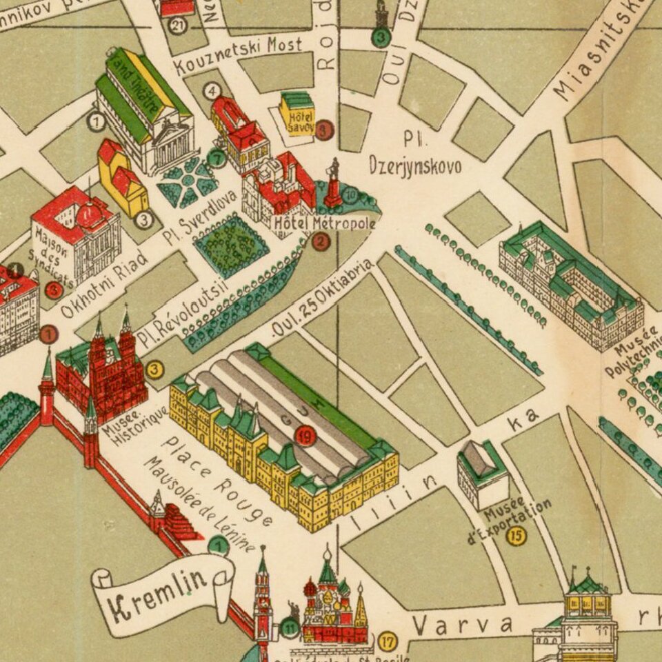 This interesting map provides a rare Western-language pictographic map of Moscow, then the capital of the Soviet Union, and one of the intriguing enigmas to Westerners. The map features the center of the city, with the Kremlin the middle. Curiously, while the walls of the Kremlin are outlined, no details with respect to the buildings inside are included. As the Kremlin was the epicenter of the Soviet government, no foreigners were allowed to visit the complex, and so details were removed so as not to encourage any 'undue curiosity'. Key illustrated sites include Red Square, Lenin's Mausoleum, the Hotel Metropole, the Bolshoi Theatre, St. Basil's Cathedral, amongst many others. A key in the lower right identifies 19 general sites, 38 theaters, 18 museums, 11 monuments, 8 train stations, 4 hotels, and the "Intotourist" travel center.