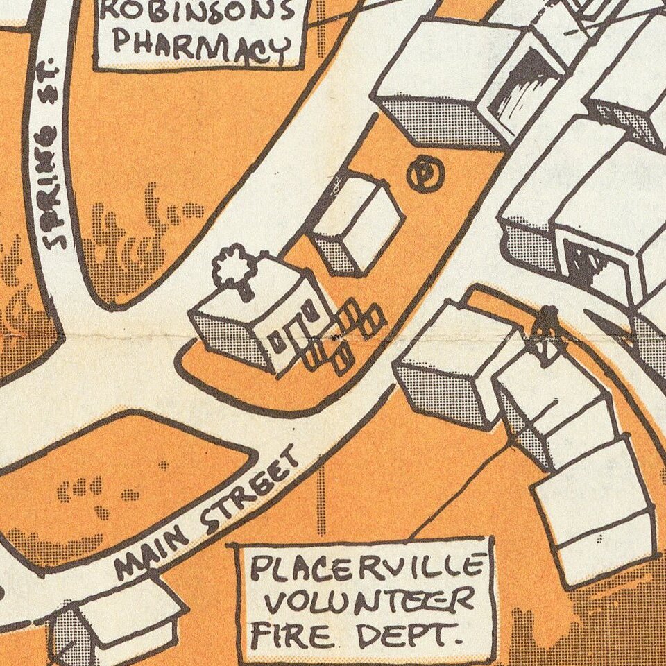 Lively pictorial advertising map for Placerville, California, issued in the mid-1970s.