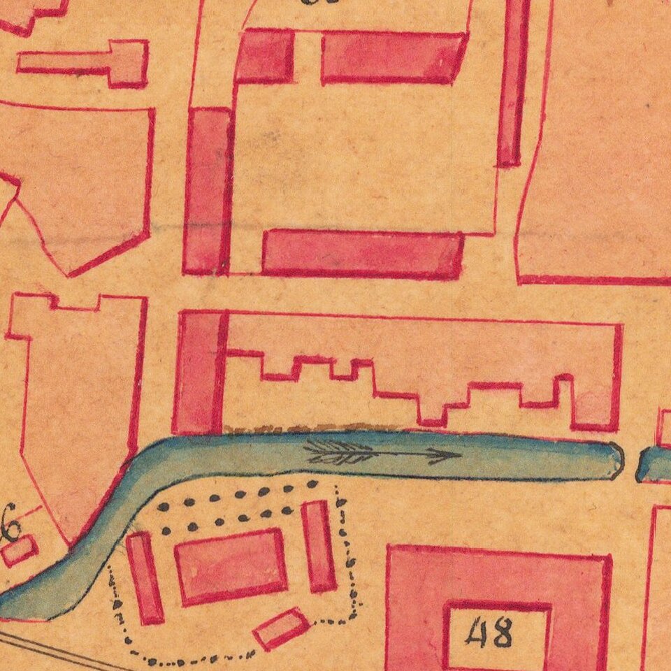 In the eighteenth century, the town and its formidable fort became a training ground for the French Army. It housed the artillery school, thanks to Vauban’s arsenal. Its most famous student was none other than Napoleon Bonaparte, who as a young lieutenant studied to be a gunner in Auxonne. The year this plan depicts, 1816, was just months after Napoleon had been imprisoned on St. Helena after leading Europe in two decades of war. He died on the Atlantic island in 1821, just before this plan was finished with its additional note.