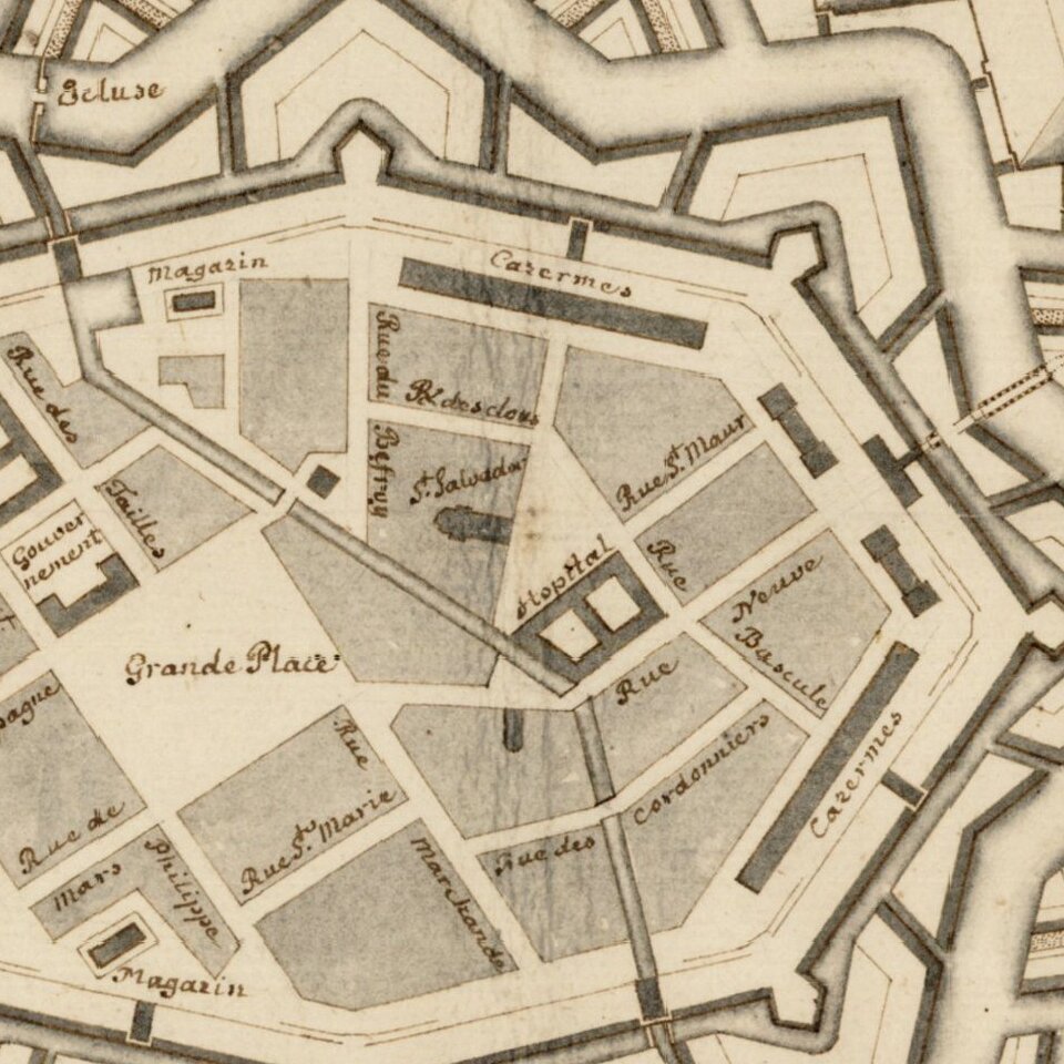 The map is oriented with southeast at the top and illustrates an elaborate set of European style fortifications in the style of Sebastian Le Prestre de Vauban, the Marquis of Vauban (1622-1707). Vauban's skills for designing fortifications became the dominant model of siege craft and fortification in the late seventeenth century and continued to influence fortress architecture well into the eighteenth century.