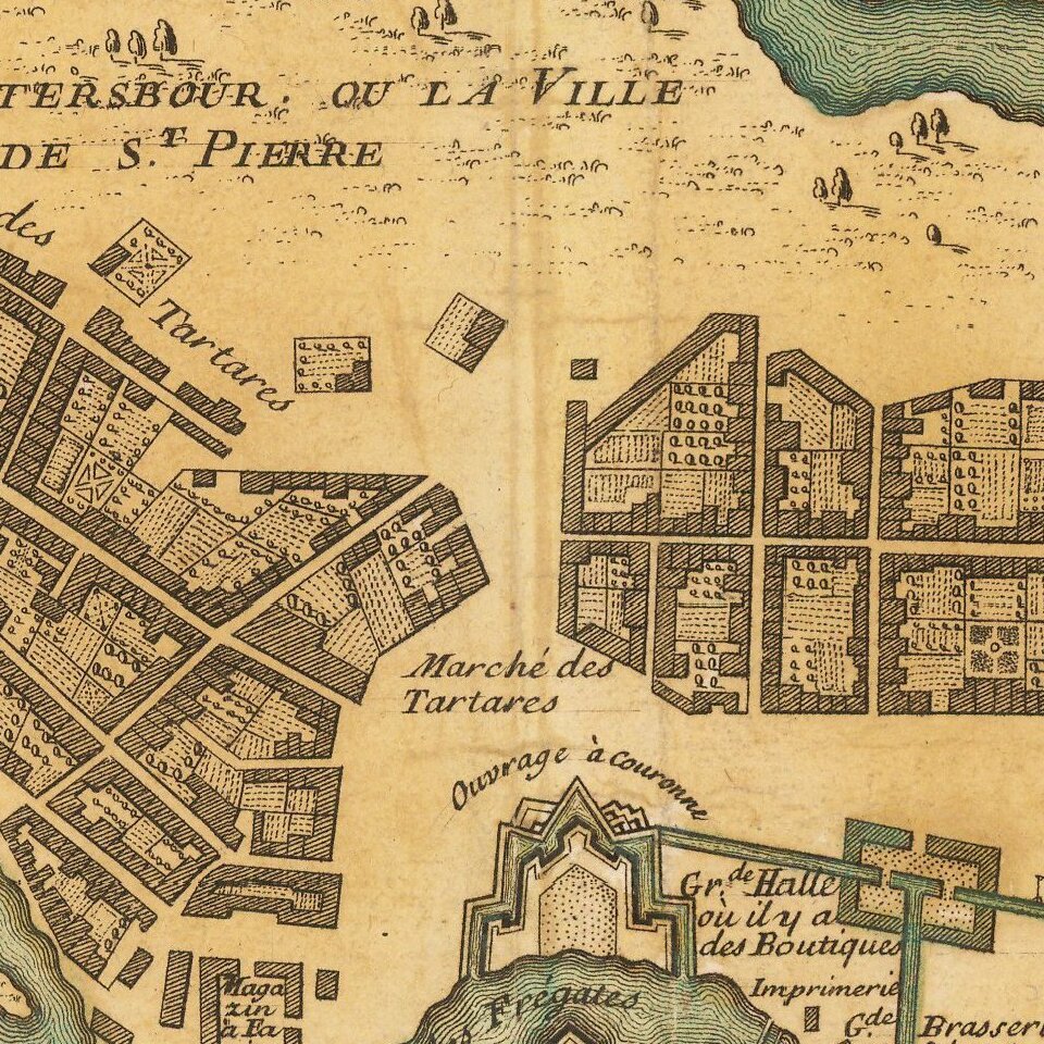 The first printed map to depict a version of the Le Blonde-Trezzini plan was Nicolas De Fer's Plan de la Nouvelle Ville de Petersbourg (Paris, 1717).