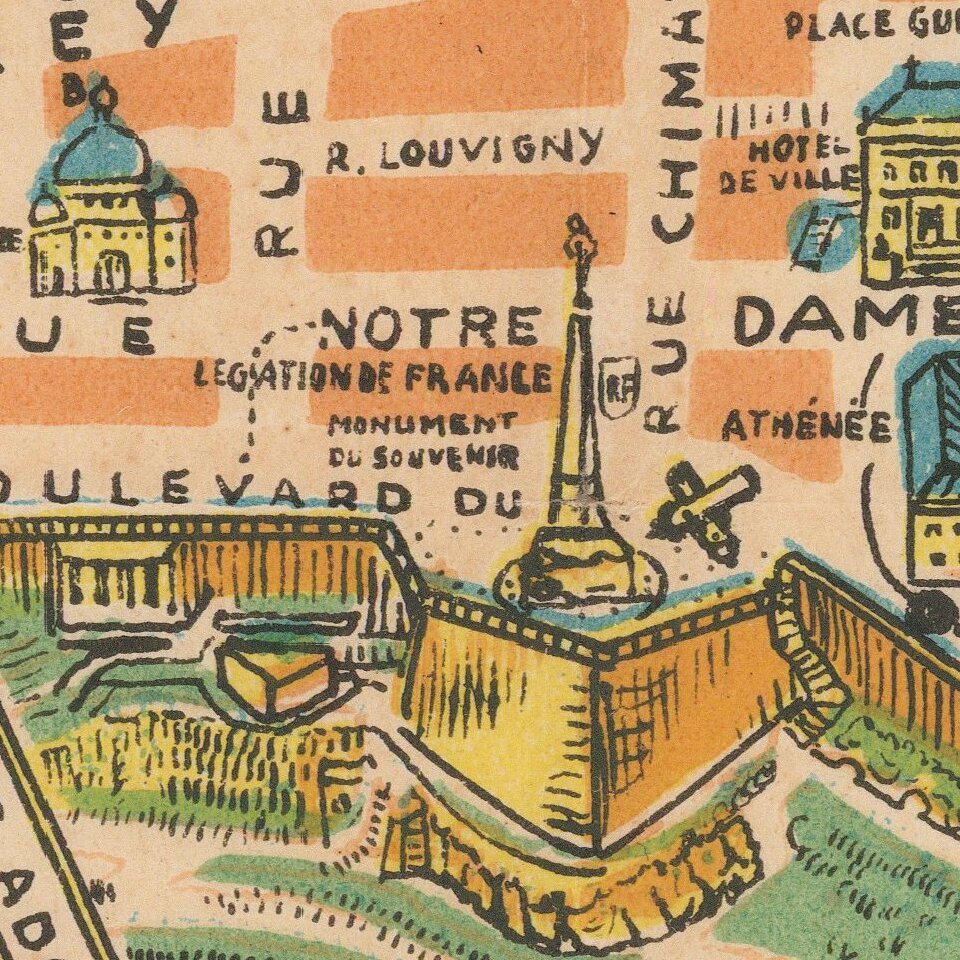 Superb color-printed view of Luxembourg City, with the monuments and landmarks of the city rendered pictorially.
