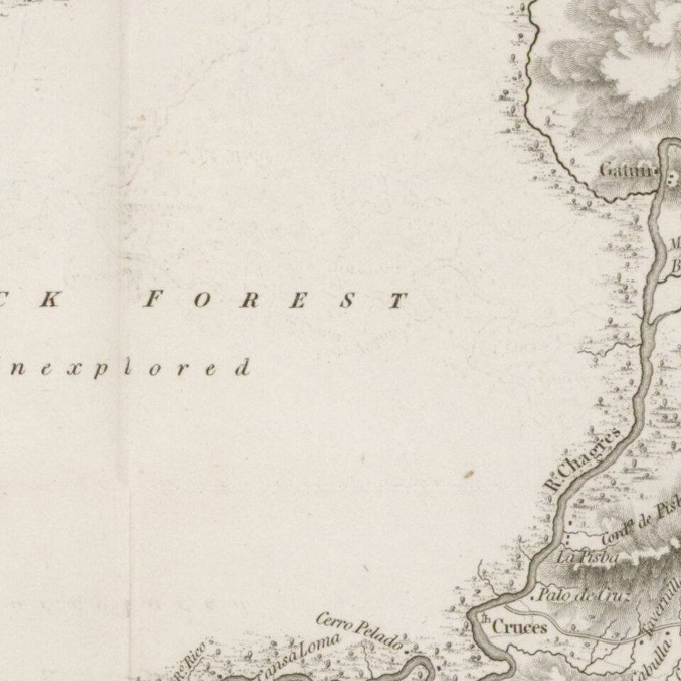 This detailed topographical map depicts the region surrounding the narrowest portion of the Isthmus of Panama, based on surveys conducted by John Augustus Lloyd between 1828 and 1829. Around the time that railroads were being invented, President Bolivar of Gran Colombia commissioned a study of the area between Chagres and Panama City with the intent of building a railroad to connect the Atlantic to the Pacific Ocean. Although the report concluded that a railroad was possible, the project was abandoned until 1850, when US privateers began building the Panama Railroad.