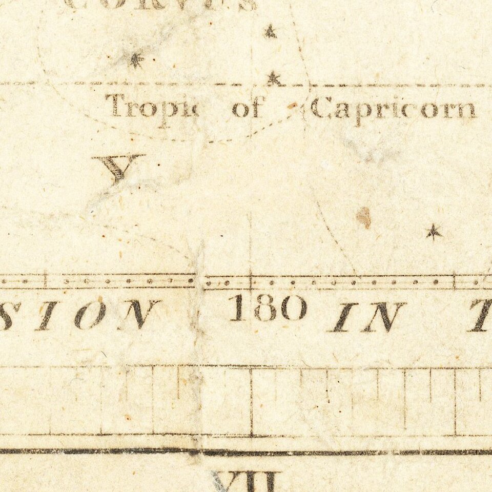 Drawn by J. W. Norie, who worked for William Heather, the publisher, the chart shows two parallel expanses of stars. The top strip shows the constellations as they relate the ecliptic, which waves through the strip chart. At top and bottom are the right ascension given in time and degrees, that is the east-west coordinate by which a celestial body (including constellations) is measured (i.e. the angular distance of a body’s hour circle east of the vernal equinox, measured along the celestial equator). The other axis measures north and south declination, that is the angular distance of a point (or constellation) north or south of the celestial equator.