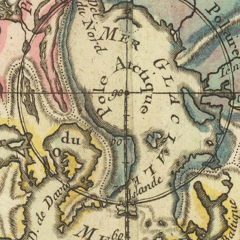 The continents of the world radiate from a central point, the North Pole. The lands are color coded according to which ocean their watershed empties. The most prominent features are the mountain ranges, which divide the land and the seas. Some are actual mountain ranges, others are placed where Buache hypothesized they must be, for example along the sea floor. To the south, near Cap de la Circoncision, is an unfinished coast line which suggests the presence of another continent. New Zealand, shown on the opposite side of the projection, near the top, is also partially shown and dually labeled as an island and as Terre Antarctique.