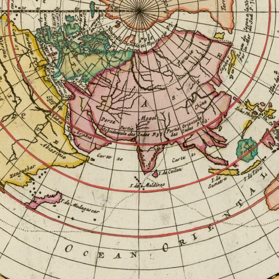 This is the first map constructed using scientific data. Under Giovanni Domenico Cassini's direction, coordinates of latitude and longitude for points throughout the world were collected by the Académie Royale des Sciences for over thirty years. These were placed on the floor of the Paris Observatory, creating a planisphere that was 24 feet in diameter, with the North Pole at the center. Cassini's son Giovanni drew the much reduced version that was then engraved by Nolin.Giovanni Domenico (also known as Jean-Dominique) Cassini, was born in Perinaldo, in the Comte of Nice, in 1625. He quickly rose in his studies to be awarded the Chair of Astronomy at the University of Bologna in 1650. Pope Alexander VII commissioned Cassini to study the navigation of the Po and Reno Rivers. One of Cassini's earliest astronomical masterworks was his calculation of the orbits of the moons of Jupiter, which resulted in the publication of his table of the eclipses of Jupiter's moons in 1668.