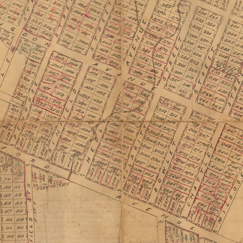 The map shows the subdivision of the area which had for decades been the location of the Merino Mill and the Merino Village, the earliest development of the region in the early 19th Century.