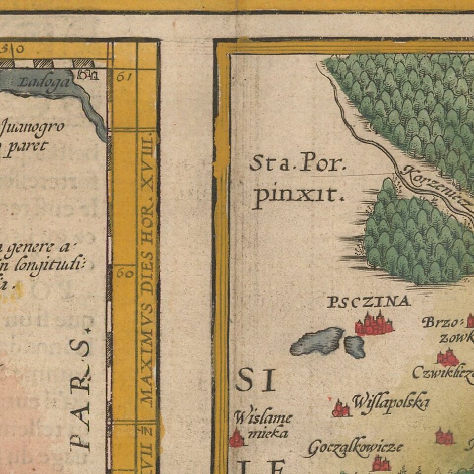 Finely colored example of Ortelius' maps of Pomerania, Latvia and part of Southern Poland above the Carpathian Mountains, from Ortelius Theatrum Orbis Terrarum.