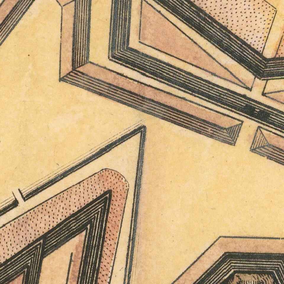 The sharply-geometric star fort sits at the center of the map and is accentuated by delicate coloring and shading. The fields surrounding the fort are segmented into squares, creating a patchwork effect. Across from the fort, hachure shading accentuates the height of the pastel-colored hills.