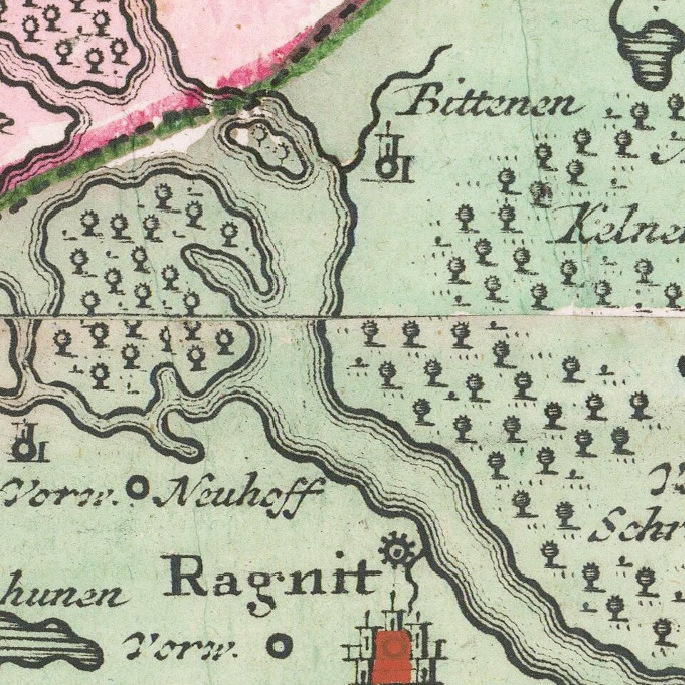 Under the large pictorial title cartouche is a plan of Gumbinnen (now Gusev, in the Kaliningrad Oblast). This was a new town, built by Frederick William I of Prussia, as he was redeveloping the area after the population had been ravaged by plague in 1711. In 1732 he resettled the area with some of the 20,000 Protestants expelled from the Archbishopric of Salzburg. Compiled by Johann Friedrich Betgen.