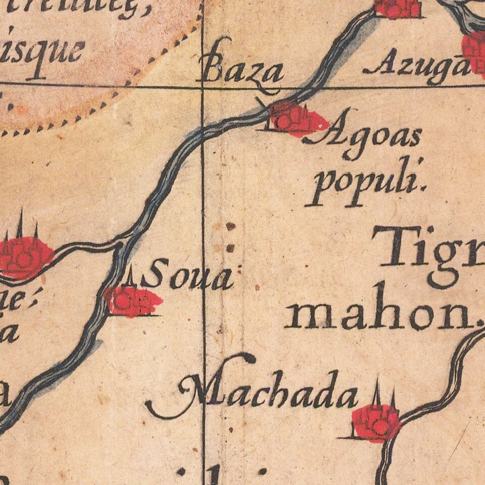 In Ortelius’ Africa map (here), included in the original 1570 Theatrum, he also included a large central lake, called Cafates. He rejected the name of Zaire-Zembere used by Gastaldi. To the east and just slightly north was another, smaller lake. Rivers from the north of both lakes wend northward and join to form the Nile. The Zaire (Congo) flows from the northeast of Lake Cafates, while the Zuama (Zambezi) exits at the south of the lake. It branches into the Spiritu Sant, or the Limpopo. Thus, one lake gives rise to four of the largest rivers in Africa.