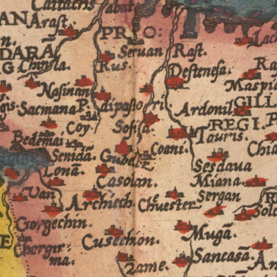 De Jode's map is based upon Giacomo Gastaldi's highly influential 2 sheet map of the region, La Descrittione Della Prima Parte Dell' Asia ... first published by Gastaldi in Venice in 1561. Gastaldi's map is the single most influential map of the region published in the 16th Century. The map would go on to be the most influential map of the region and the pro-type for the region well into the early 17th Century.