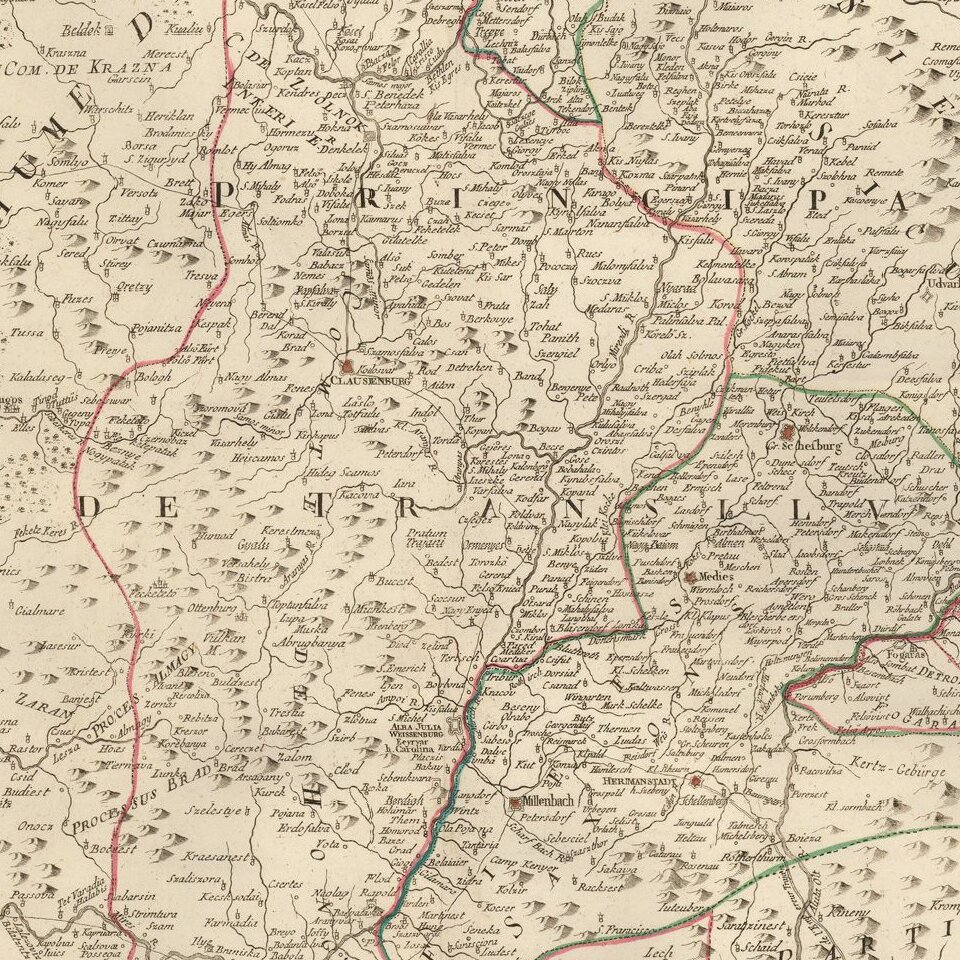 Fine outline hand-colored engraved map of Transylvania, by the Venetian cartographer Paolo Santini.