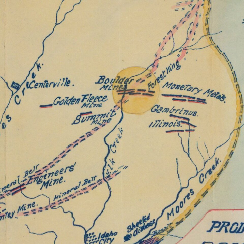 Fascinating mining map, showing the mining regions north of Idaho City, centered on Centerville, Idaho, in the area of the Boise National Forest.