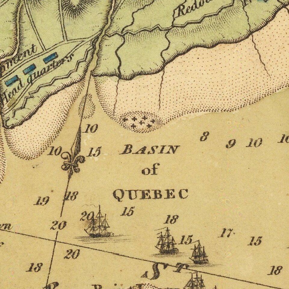 This fascinating map embraces the environs of Quebec City and illustrates the British victory on the Plains of Abraham in 1759, the fateful showdown between the armies of General James Wolfe and the Marquis de Montcalm. It shows the city and topography in carefully rendered detail. All of the main scenes of action surrounding the British siege are shown, including the abortive attack on Beauport, the British Headquarters at Levis and the site of the decisive Battle of the Plains of Abraham. The British fleet, under the overall command of Admiral Saunders, appears in pictographic form.