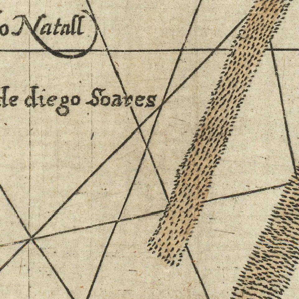 The extensive details of coastal and other navigational points are likely based on portolan charts of the Portuguese, especially those by Bartolomeu Lasso. Linschoten was "one of the pathfinders for the first Dutch voyages to the East" (Schilder, p. 195). He was in the service of the Portuguese as Secretary to the Portuguese Archbishop of Goa in India from 1583 to 1589. Here, he had access to many Portuguese portolans as well as other valuable commercial information, especially as Goa at this time was the commercial and political center for the Portugal Empire in the East. Van Linschoten left Goa for home in January 1589. On the way to Portugal, his ship was pursued by an English fleet and lost its cargo in a storm while anchored off the Azores. After the loss of the cargo, Van Linschoten was persuaded to stay and help recover it; he spent two years on Tercera, working and preparing his notes from Goa.