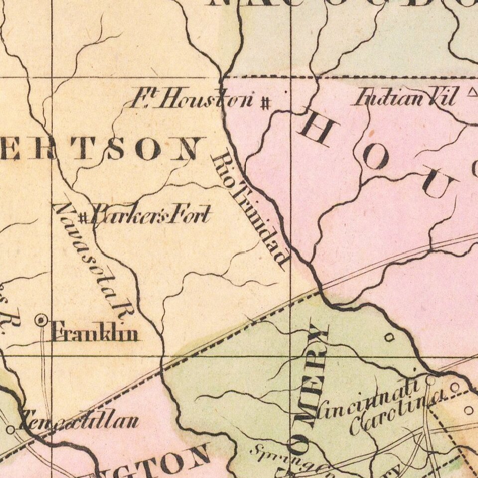 The progress of settlement and the nearly total lack of information in the west, a region that was to remain primarily the domain of the Comanche and the coyote for another thirty years.The map shows a combination of early counties and empresario grants, along with early roads, trails (Santa Fe), forts ("Ft. Houston," "Parker's Fort"), rivers, and mountains. A number of Indian tribes are shown, including Apaches Faraones, Apaches Mescateros, and Apaches Mescoleros.