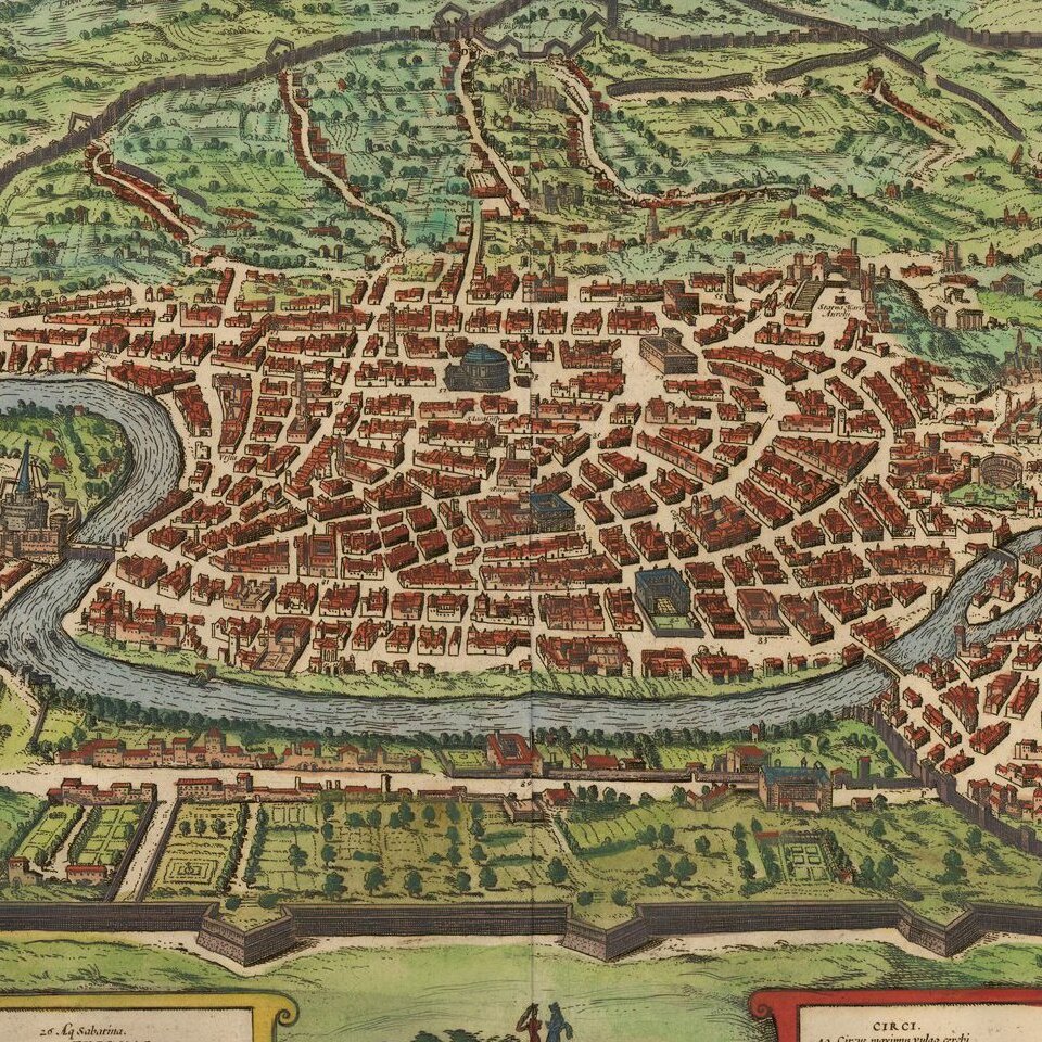 Striking bird's-eye plan of Rome with decorative title cartouche, showing the city as it was c. 1550. Included are various surviving features of ancient Rome: the surrounding walls, the Pantheon, the Coliseum, the Arch of Constantine, and the Forum Romanum. In the left corner in the foreground can be seen the Papal Palace and the Obelisk from the circus of Caligula and Nero.