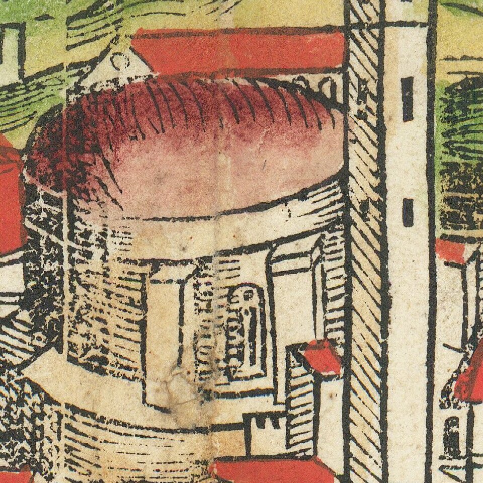 Schedel's view of Rome is one of the earliest obtainable views of the Eternal City, and, realistically, the only large format 15th-century illustration of Rome available to collectors. While the illustration is less than accurate, the Castel de San Angelo, the Vatican, Colosseum, Pantheon, Belvedere, and Mausoleum of Hadrian are clearly depicted among other features.