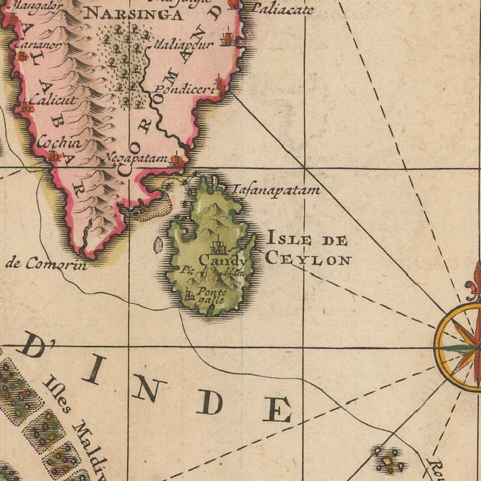 Fine example of the Cornelis De Bruyn map of the Indian Ocean, showing his route from Gamron (modern Bandar Abas) to Batavia (Jakarta).