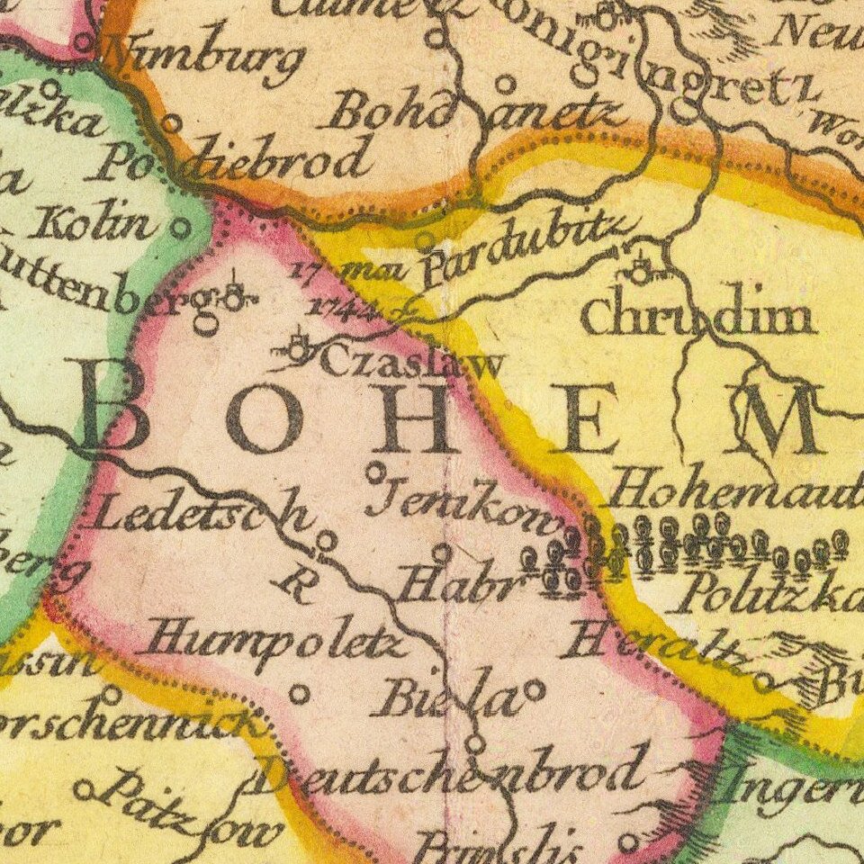 Detailed map of the Bohemia, Moravia and Austrian Silesia, published in De Vaugondy's first atlas.