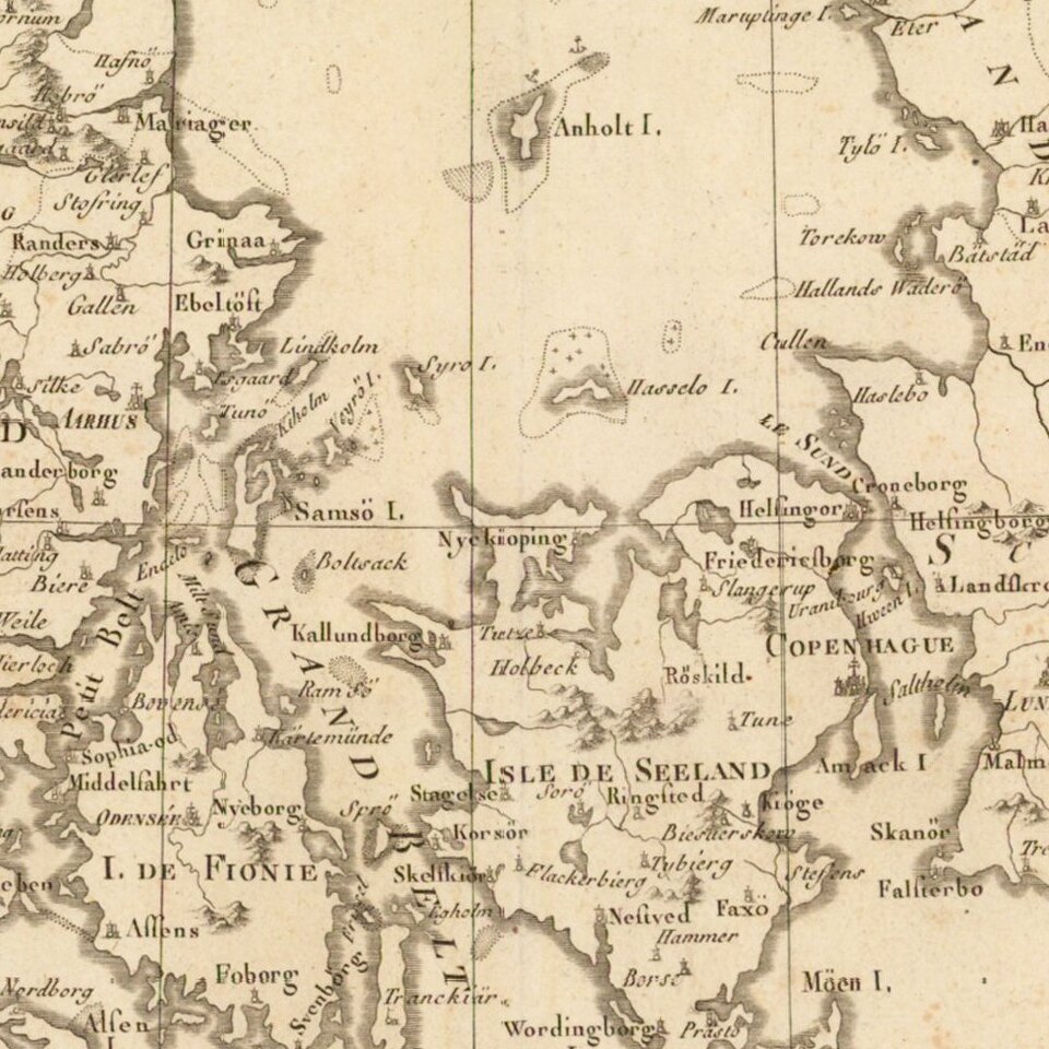 Attractive map of Denmark, with details of cities, rivers, land masses, and oceans.