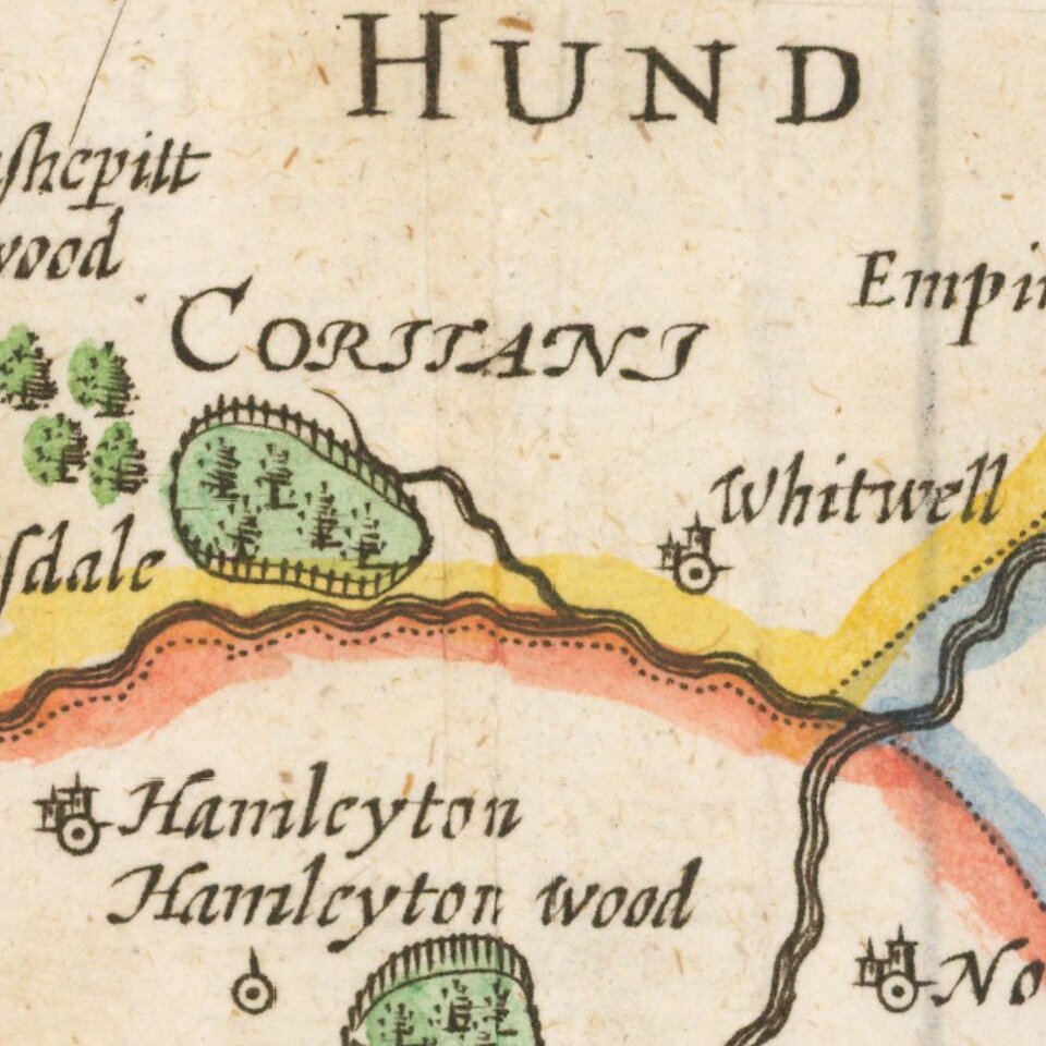 Includes multiple coats of arms and a large inset plan of the town of Stanford (Stamford) and Oukham (Oakham).