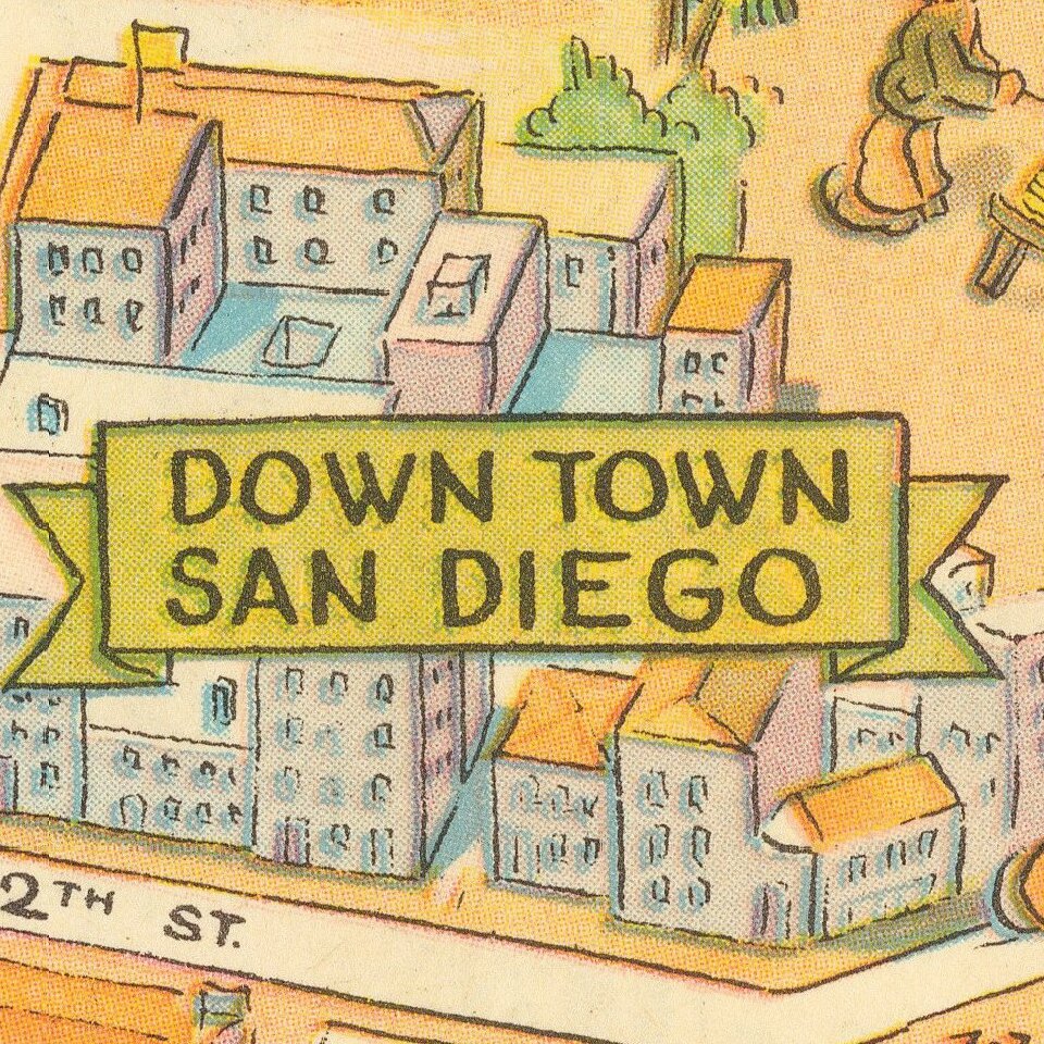 The San Diego side contains all the neighborhoods of the city from Pacific Beach to the border and shows the region inland as far as Cuyamaca. Vignettes around the side of the map provide some historical context, but the true interest lie in the map itself, which provides a unique view of the city at the end of the Depression. Downtown San Diego is the only densely built-up area, though various small towns exist in Pacific Beach, Loma Portal, National City, and Chula Vista. No major settlements are shown inland. Poway Valley is full of vineyards, while El Cajon Valley has some orchards. Further inland ranchers can be found. The military presence is visible throughout the city, with the area now known as Kearny Mesa marked as "Formerly Camp Kearny." Street names have changed as well, with Atlantic Street being replaced by the (more accurately named) Pacific Highway. This renaming was done in June of 1935, likely in conjunction with the exposition.