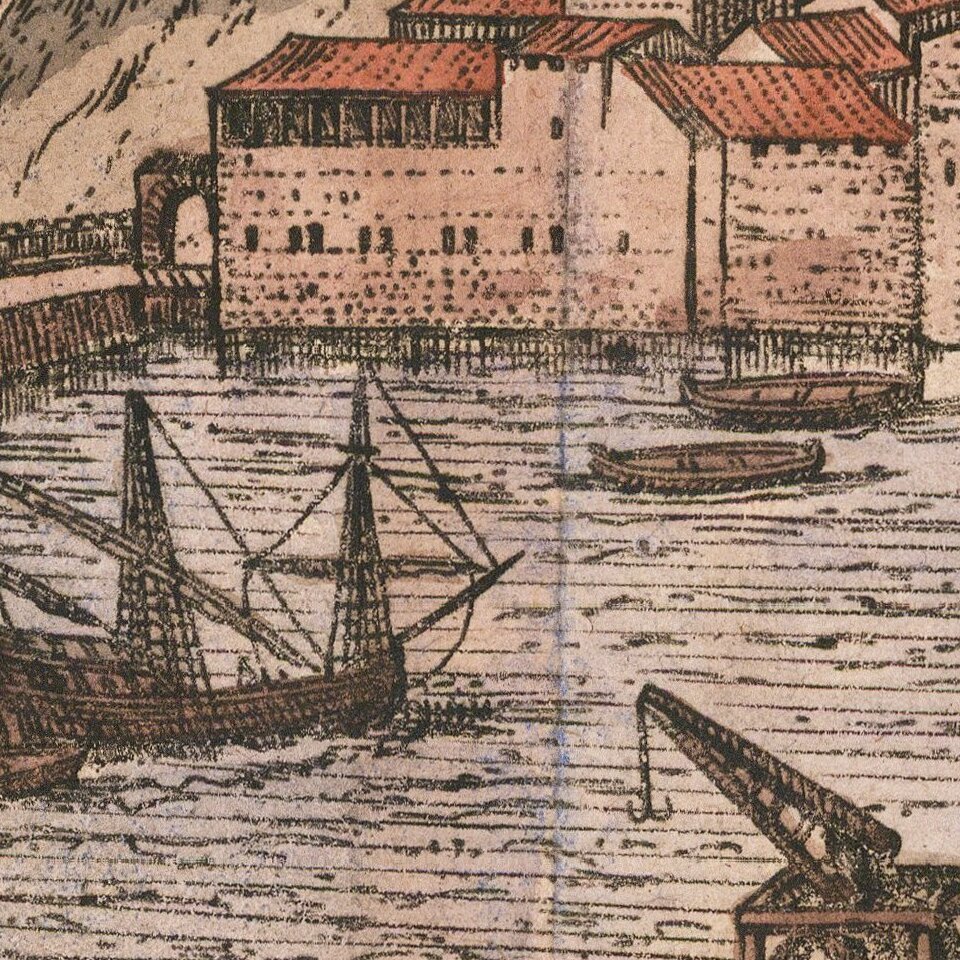 Georg Braun (1541-1622) was born and died in Cologne. His primary vocation was as Catholic cleric; he spent thirty-seven years as canon and dean at the church St. Maria ad Gradus, in Cologne. Braun was the chief editor of the Civitates orbis terrarum, the greatest book of town views ever published. His job entailed hiring artists, acquiring source material for the maps and views, and writing the text. In this role, he was assisted by Abraham Ortelius. Braun lived into his 80s, and he was the only member of the original team to witness the publication of the sixth volume in 1617.