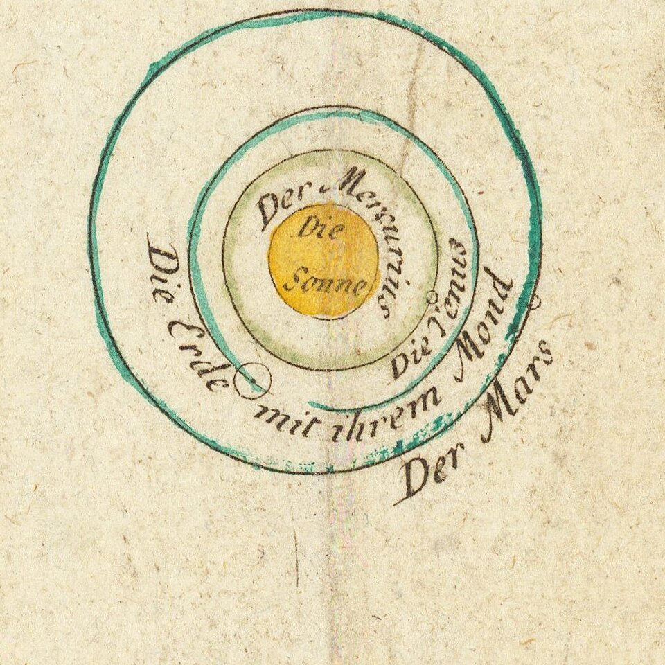 Of particular interest is Figure 13, labeled "Systema Tychonicum" and Figure 12, labeled "Systema Solis et Planetarum secundum hypothesin Copernici." This is evidently referencing the sixteenth-century debate over the nature of the Solar System. Tycho Brahe argued for a complex system, with the earth rotating the sun, but with the rest of the planets and fixed stars rotating around the earth. Copernicus devised the system we now recognize today, and in Figure 12 even Saturn and Jupiter with their respective moons are shown rotating the sun. By the time this map was made, the debate was settled in the scientific community, this is evidenced by Figure 12 taking up the center of the image while Figure 13 is smaller and to the bottom.