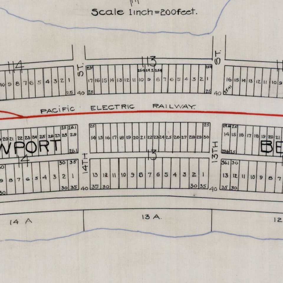 Detailed map of part of Newport Beach, showing the route of the Pacific Electric Railway from 11th Street to 16th Street, along Ocean Avenue and Central Avenue, showing the water lines on both the Newport Bay and Pacific Ocean sides of the peninsula, the property of the Newport Beach Company and Property of the Pacific Electric Railway Co.