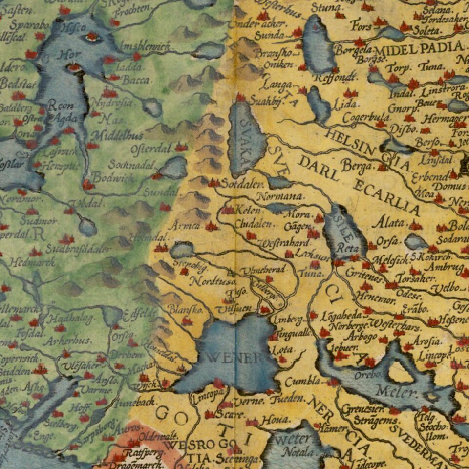 Colored example of De Jode's map of Scandinavia, the Baltic and Gulf of Finland, extending from Iceland and the Coast of Scotland to Novograd, St. Petersburg and the Norwegian Sea.